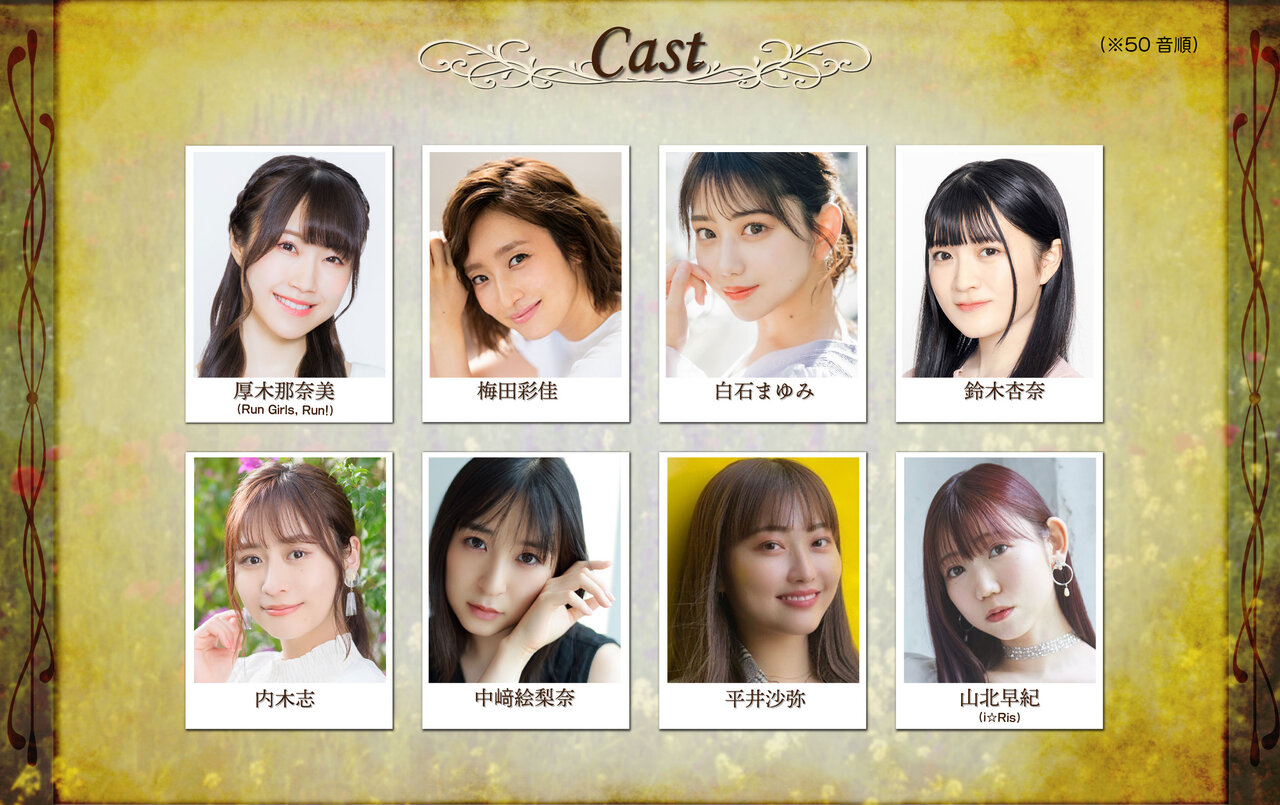今回のキャストは、厚木那奈美さん(Run Girls, Run!)・梅田彩佳さん・白石まゆみさん・鈴木杏奈さん・内木志さん・中﨑絵梨奈さん・平井沙弥さん・山北早紀さん(i☆Ris)の8名が出演します。
