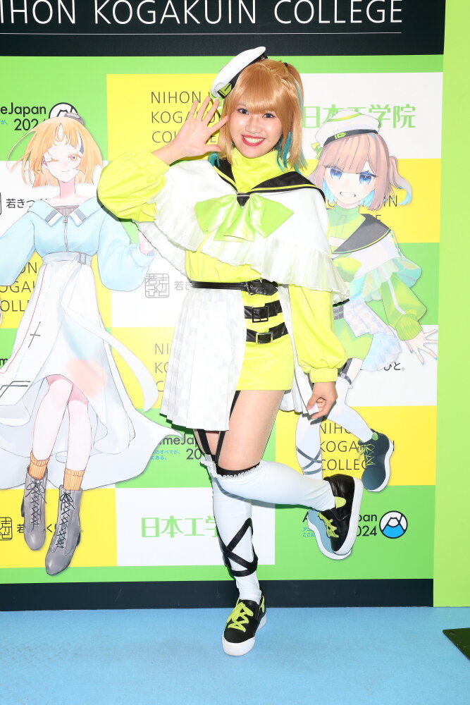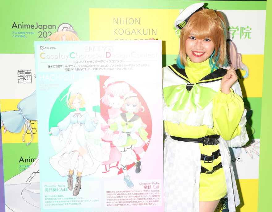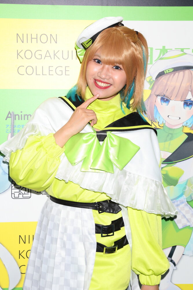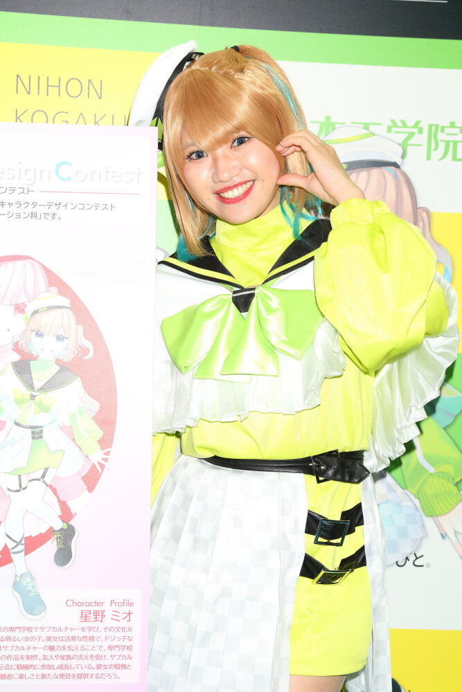今回、平岡さんがコスチュームを着ております「星野ミオ」とは、日本工学院のマンガ・アニメーション科の在校生によるコスプレキャラクターデザインコンテストで選ばれました作品でテーマは「マンガ・アニメーション科」です。