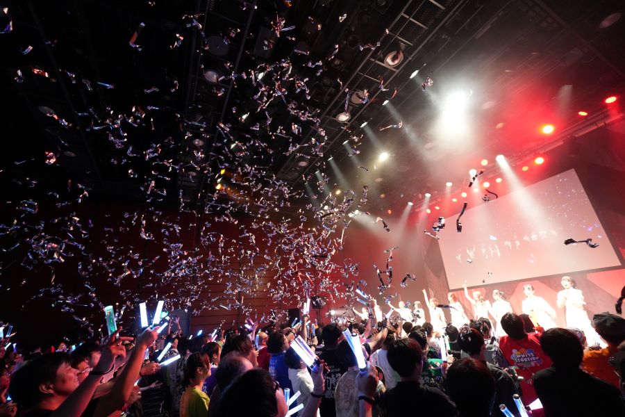 Overtureが流れメンバーが登場すると、デビューデジタルシングル『眼差しSniper』からスタート。メンバーの名前が刻まれた銀テープが飛び出し華やかにスタートした。